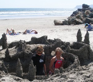 While eating our lunch, there were some kids on the beach building a really awesome sand castle and on later inspection it was actually a sand fort. They had dug this huge hole and were building a fortress around it. One of the boys working on the fort had been in Elyse’s surfing class and he was about a year or two older than her. She said to me, “don’t you think that boy is cute?” I agreed and suggested she go down and help them with their fort. Surprisingly she got very shy, and said no it would be too awkward, and what if they didn’t need her help or what if they wouldn’t talk to her?
