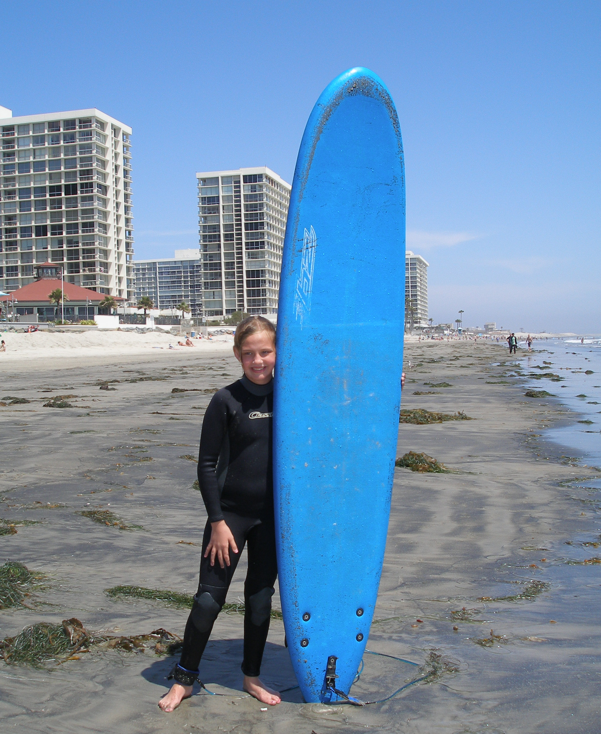 Laying by the pool and swimming had its fun moments, unfortunately there were no kids around the first day and I could tell she was getting a little bored, but I knew she would never say anything. I had noticed that The Del gave surfing lessons. I casually suggested this to Elyse (who is an awesome swimmer) and she jumped at the opportunity. We went and signed her up for two morning classes for Saturday and Sunday. And she would be in a group of 10-15 year old kids, so maybe she could meet some kids for the weekend to hang out with at the beach or the pool.